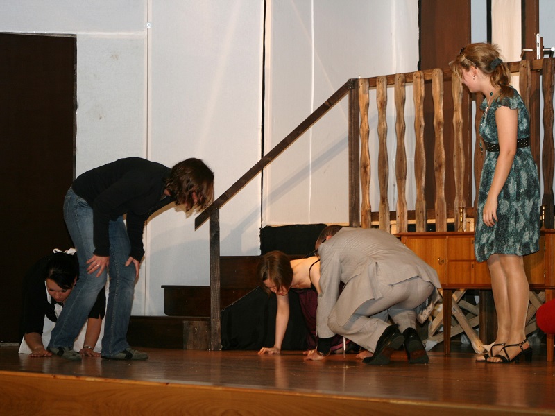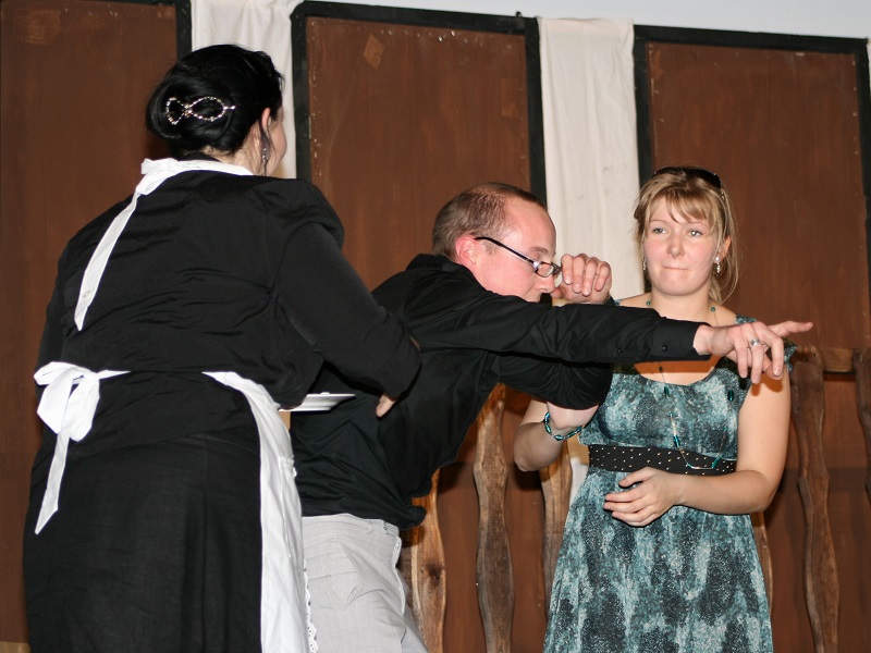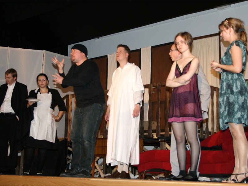 Die Besetzung der Rollen passte wie die Faust aufs Auge – die Schauspielerinnen und Schauspieler waren überzeugender denn je. Thomas Krieger, der bereits in vielen TheaterLaien-Produktionen Regie geführt hat, schlüpfte in die Rolle von Regisseur Lloyd, der an seinem Ensemble verzweifelte. Der Clou dabei: Die meiste Zeit verbrachte er im Zuschauerraum, rief seine leicht cholerischen Kommandos aus dem hinteren Teil der Aula um kam nur hin und wieder gemächlichen Schrittes auf die Bühne gelaufen. Die zynischen Einwürfe sorgten für wahre Lachsalven im Publikum – besser hätte man das nicht spielen können.