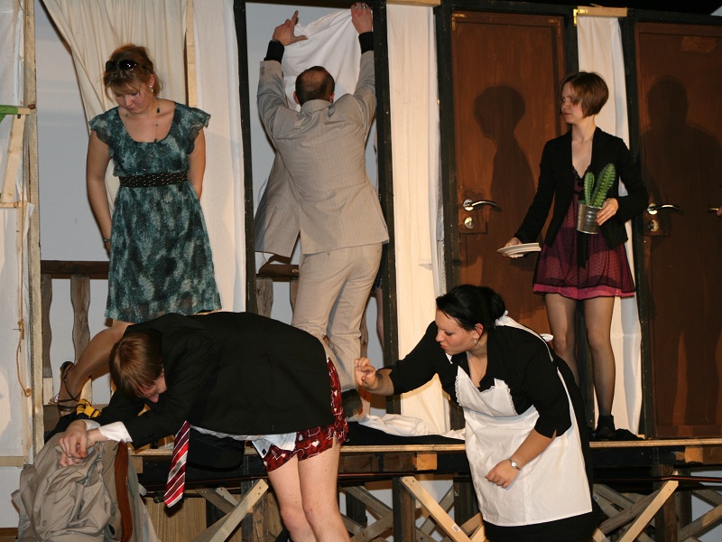 Er beeinflusste das Spiel der anderen Schauspieler in besonderem Maße: Conrad Baege begeisterte als chronisch nervöser Garry, der seine Sätze grundsätzlich unvollendet ließ – Thomas Krieger verstand sie trotzdem. Oliver Schürmann brillierte als schwerhöriger Seniorschauspieler Selsdon – wunderbare Dialoge zwischen ihm und Krieger entspannen sich daraus. Martin Callies bestach als Frederick, ein Schauspieler, der für jede seiner Handlungen einen besonderen Grund braucht – während Krieger an ihm verzweifelte, blieb beim Publikum kein Auge trocken. Und auch ein bisschen nackte Haut durfte nicht fehlen beim „nackten Wahnsinn“: Annika Rupp traute sich was – nämlich im transparenten Negligé und sexy Nylon-Strümpfen auf die Bühne. Sie konnte sich sehen lassen – sowohl im Kostüm als auch in ihrer Rolle der verträumten Brooke.