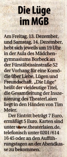 Am Freitag, 13. Dezember, und Samstag, 14. Dezember, hebt sich jeweils um 19 Uhr in der Aula des Mädchengymnasiums Borbeck an der Fürstäbtissinstraße 52 der Vorhang für eine Komödie über Liebe, Lügen und Freundschaft. „Die Lüge“ heißt der vieldeutige Titel, die Gesamtleitung der Inszenierung des TheaterLaien liegt in den Händen von Tim Meier.
