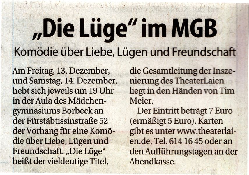 Theaterfreunde können sich den Termin schon einmal in den Kalender eintragen: am Freitag, 13. Dezember, und Samstag, 14. Dezember, hebt sich jeweils um 19 Uhr in der Aula des Mädchengymnasiums Borbeck an der Fürstäbtissinstraße 52 der Vorhang für eine Komödie über Liebe, Lügen und Freundschaft.